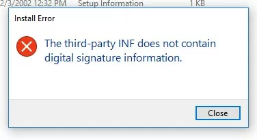 If you right-click on the inf driver file and select Install when installing a driver from File Explorer, you receive an error: