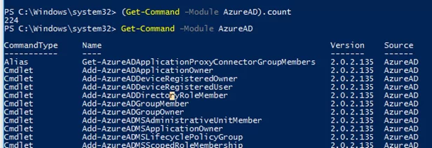 In this AzureAD module version, there are 224 cmdlets containing *-AzureAD* in their names. You can display a list of available cmdlets in the module as follows: