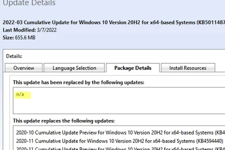 Click on the name of the security update KB5011487. In the next window with update info, go to the Package Details tab. This tab shows which updates this update replaces (This update replaces the following updates) and which update it replaces in turn (This update has been replaced by the following updates).