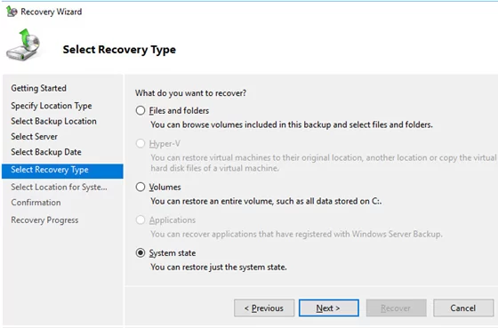 Windows Server Backup Note: This recovery option will cause replicated content on the local server to re-synchronize after recovery. This may cause potential latency or outage issues.